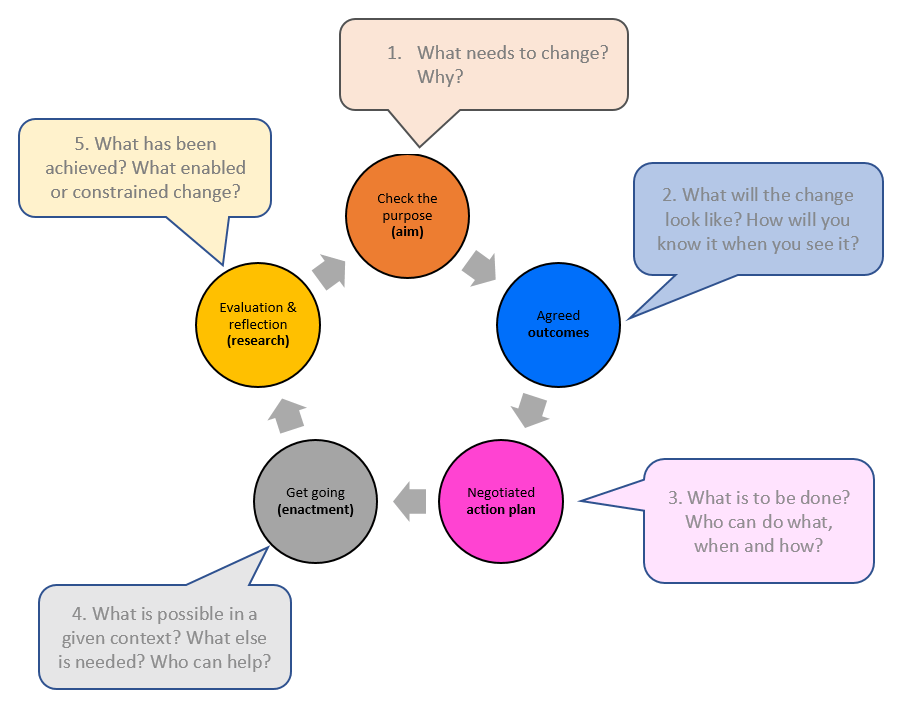 STEP 5 – Evaluate the impact: Evaluation and reflection on the impact is essential for identifying both intended and unintended outcomes of change activity. The extent to which the desired change has been achieved may involve different perspectives and use research and inform further planning.